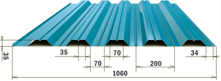 Стеновой профнастил НС35 — это строительный материал, который представляет собой профилированный лист с гофрами в форме трапеции. Цифра «35» обозначает высоту гофры в миллиметрах.